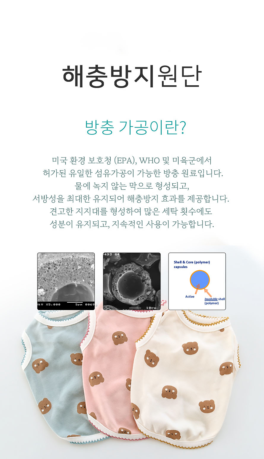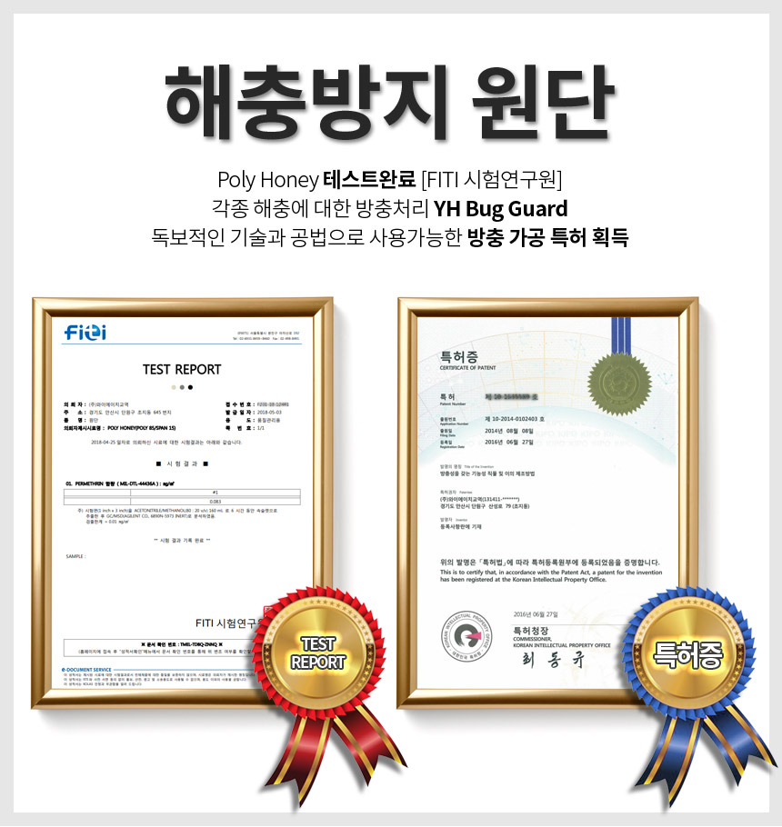 특허증과 FITI 시험연구원에서 테스트 받은 안전한 방충 가공으로